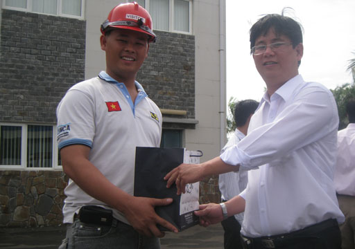 Thầy Lâm Thành Hiển thay mặt nhà trường tặng quà và cám ơn công ty