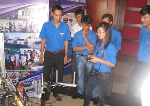 Bạn gái ở Tỉnh đoàn Kiên Giang rất thích thú với Robot bằng tay của trường