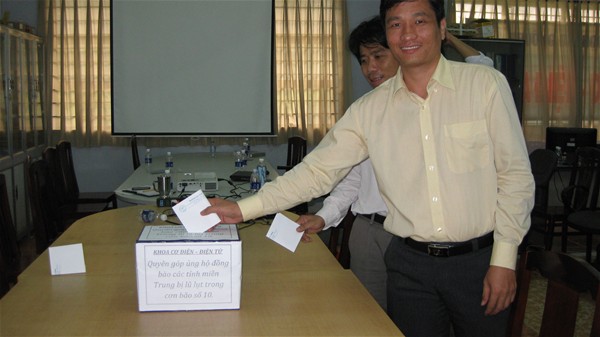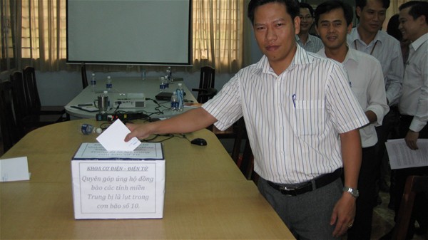 Miền Trung là khúc ruột của đồng bào, là đòn gánh ngang gánh hai đầu đất nước và là nơi oằn lưng chống chọi với thiên tai. Đắng lòng khi “bầu” nhìn “bí” rơi vào cảnh “màn trời chiếu đất”, nhằm chung tay đóng góp và sẻ chia đau thương với đồng bào miền Trung trong cơn bão lũ. Ngày 12/10/2013 Khoa Cơ điện – Điện tử phát động phong trào quyên góp “Một miếng khi đói bằng một gói khi no”.