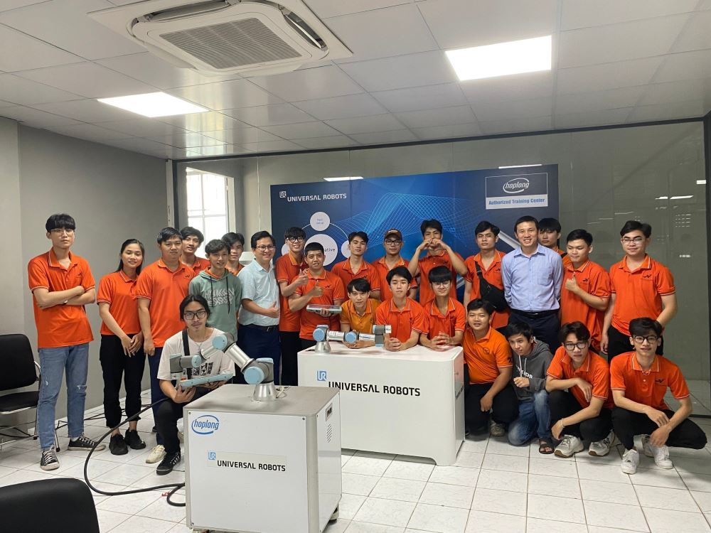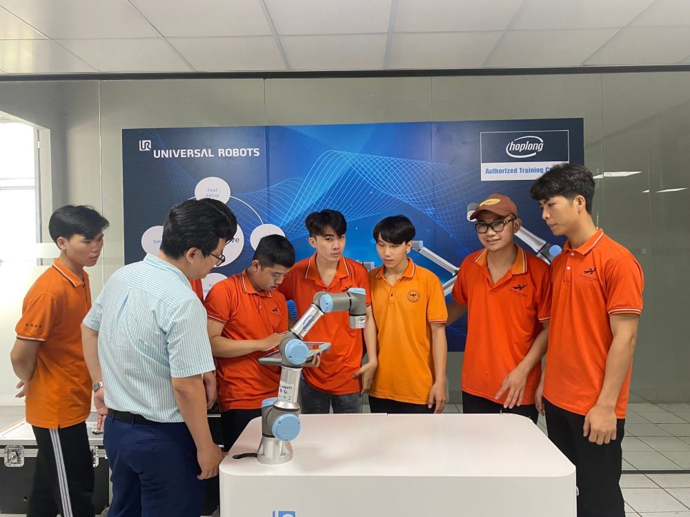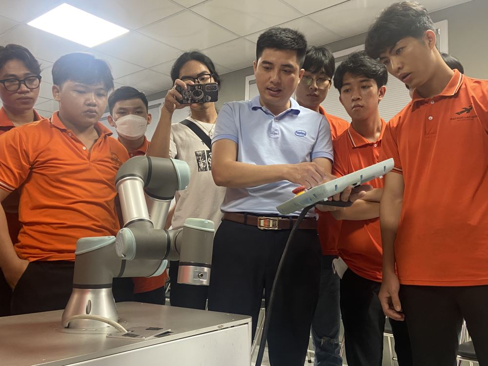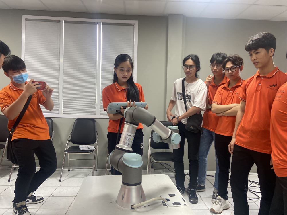Với định hướng chiến lược của nhà trường trong hoạt động đào tạo hiện nay, đặc biệt chú trọng đến các môn học có sự phối hợp giữa giảng viên và các chuyên viên kỹ thuật công nghệ của doanh nghiệp trong hoạt động giảng dạy nhằm mục đích nâng cao chất lượng đào tạo, vừa qua Khoa Cơ điện-Điện tử đã tổ chức cho các bạn sinh viên lớp 20DC111 do thầy TS. Huỳnh Tuấn Tú và thầy ThS. Lê Hoàng Anh phụ trách giảng dạy môn học Robot Công nghiệp tham quan và trải nghiệm robot thực tế của hãng Universal Robot do công ty Hợp Long phân phối chính thức tại Việt Nam.