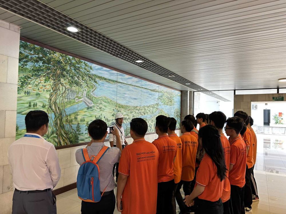 Các bạn sinh viên đang được nghe về lịch sử xây dựng nhà máy điện Trị An