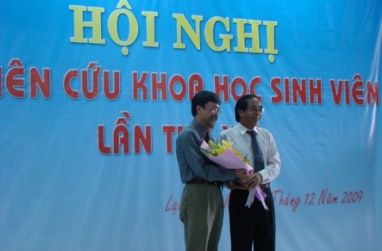 TS Trần Hành - Hiệu trưởng nhà trường (người mặc áo trắng) tặng hoa cho PGS TS Trần Văn Lăng chủ tịch hội đồng giám khảo NCKH sinh viên 2009 khối ngành kỹ thuật