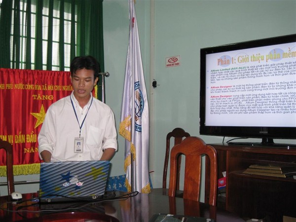 Nội dung buổi báo cáo xoay quanh những vấn đề như: ứng dụng cảm biến điện dung, điện từ vào trong công nghiệp và việc sử dụng phần mềm Altium thiết kế một số bo mạch điện tử. Sau khi lắng nghe báo cáo, nhiều vấn đề được đưa ra tranh luận sôi nổi.