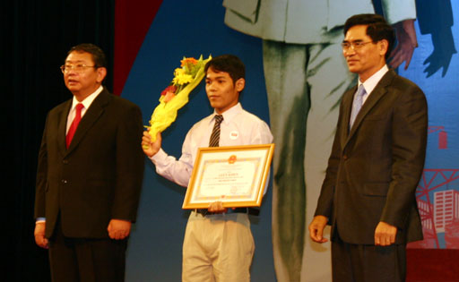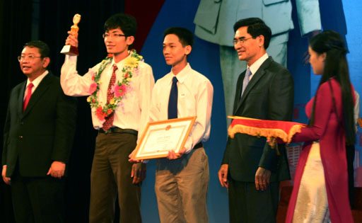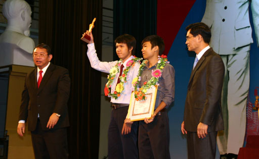 Sinh viên Hồ Tạ Quyền - Mai Văn Hùng nhận bằng khen và cúp (giải nhất)