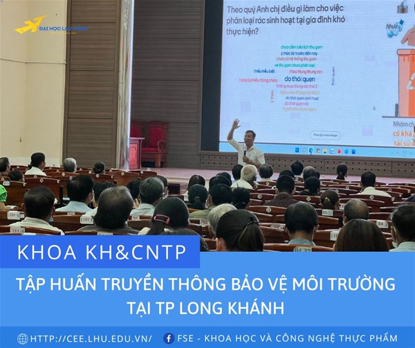 Ngày 26/8/2022, Khoa KH&CNTP đã tham gia chia sẻ chuyên đề Kỹ năng truyền thông bảo vệ môi trường tại Hội trường UBND TP Long Khánh cho hơn 300 cán bộ tuyên truyền viên tại 15 phường, xã, đại diện các Hội, Đoàn thể, Thành đoàn, Liên đoàn lao động, Hội Nông dân, Hội Cựu chiến binh, Hội Liên hiệp Phụ nữ, Hội Chữ thập đỏ, Hội Nạn nhân chất độc da cam/Dioxin, Hội Người cao tuổi và các Hợp tác xã, Tổ hợp tác vệ sinh môi trường, Hợp tác xã Dịch vụ nông nghiệp trên địa bàn TP Long Khánh.