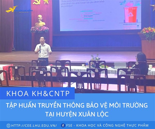 Ngày 06/9/2022, Khoa KH&CNTP đã tham gia chia sẻ chuyên đề Kỹ năng truyền thông bảo vệ môi trường tại hội trường nhà văn hóa huyện Xuân Lộc cho hơn 200 cán bộ tuyên truyền viên tại các xã, đại diện các Hội, Đoàn thể, Thành đoàn, Liên đoàn lao động, Hội Nông dân, Hội Cựu chiến binh, Hội Liên hiệp Phụ nữ, Hội Chữ thập đỏ, Hội Người cao tuổi và các Hợp tác xã, Tổ hợp tác vệ sinh môi trường, Hợp tác xã Dịch vụ nông nghiệp trên địa bàn huyện.