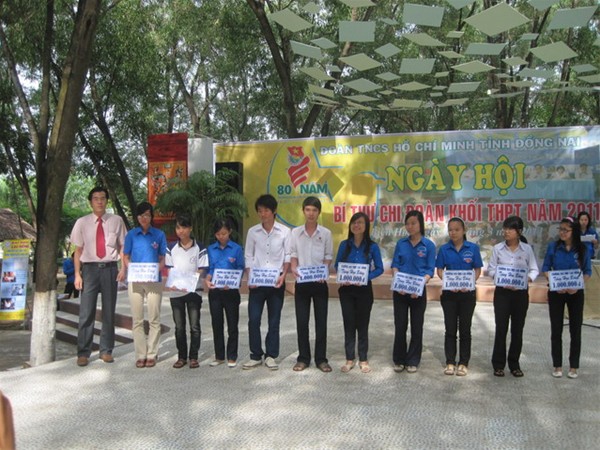 Sau tiết mục văn nghệ đặc sắc của đoàn trường, thầy Hồ Viễn Phương đã thay mặt trường trao tặng 10 phần học bổng trị giá 10 triệu đồng cho các em học sinh là cán bộ đoàn vượt khó trong học tập.