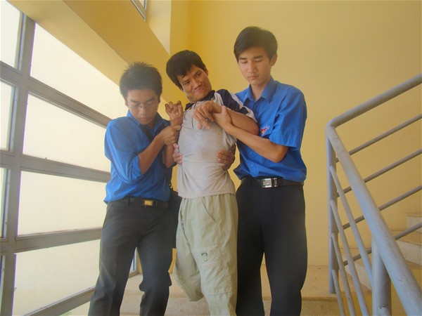 H05: Các bạn Đoàn viên Thanh niên giúp đỡ 01 nạn nhân xuống cầu thang ra về.