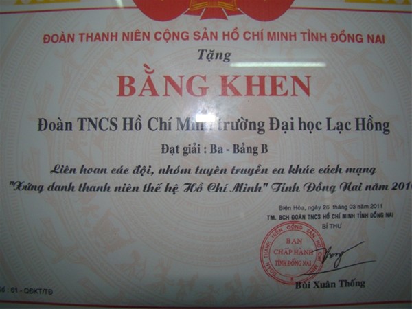 Với sự chấm điểm của Ban giám khảo chuyên nghiệp (Nhạc sĩ Vũ Đan Huyền; nghệ sĩ múa Thân Thế Thời; nhạc sĩ Thái Hải và Đ/c Bùi Thị Bích Thủy - Chủ tịch Hội sinh viên tỉnh), bài dự thi tuyên truyền ca khúc cách mạng với thời lượng hơn 30 phút của Đoàn trường Đại học Lạc Hồng đã đạt được giải nhất cho bài múa "Hành khúc Lạc Hồng" và giải 3 toàn đoàn.