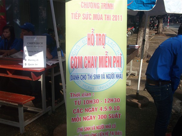 Bên cạnh đó một chương trình đặc biệt khác mà Hội sinh viên trường đã tổ chức trong chiến dịch tiếp sức mùa thi 2011. Được sự tài trợ của các nhà hảo tâm, toàn thể chiến dịch đã phát hơn 300 suất cơm chay miễn phí cho các bạn thí sinh trong các ngày thi. Những phần cơm nhỏ nhưng mang đầy tình cảm đã chia sẻ thêm phần nào gánh nặng đối với các bạn thí sinh cùng quý phụ huynh. Đ/c Nguyễn Văn Tuấn - đội trưởng cơ sở 1 chia sẻ: “chiến dịch Tiếp sức mùa thi năm nay có nét mới là được các nhà hảo tâm trợ giúp cơm chay cho các bạn thí sinh, đây là một hành động thật ý nghĩa. Vì vậy mà tinh thần các chiến sĩ tình nguyện cũng được nâng cao hơn”. Những suất cơm được các thanh niên tình nguyện phát tận tay các bạn thí sinh và phụ huynh.