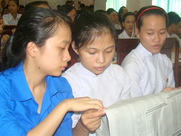 Hình 1: Các em học sinh xem tên mình được nhận học bổng trên báo Quảng Trị