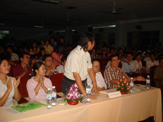 Hình 22: Giải nhất của liên hoan năm nay "Cao Phan Quang - lớp 07QT4" đang trả lời phỏng vấn của khán giả.