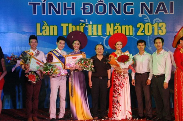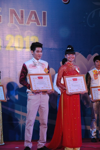 Hình 2: Thí sinh Phạm Quốc Tiến và Đào Kim Phụng (ĐH Lạc Hồng) nhận giải trang phục truyền thống đẹp nhất tại hội thi