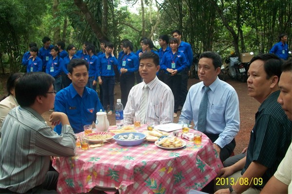 Hình 1: Đại diện nhà trường và Đoàn  - Hội sinh viên trường trao đổi với các ban ngành tại địa phương về công tác hè của trường tại Xã Bàu Hàm 2