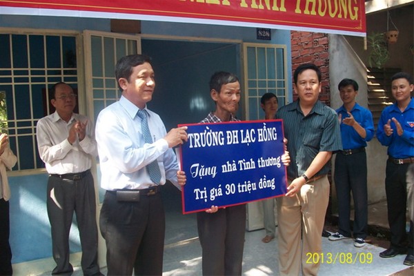 Sau gần 2 tuần xây dựng, buổi chiều ngày 09/8/2013, đại diện Ban giám hiệu nhà trường, lãnh đạo các phòng ban, đại diện Đoàn – Hội sinh viên trường ĐH Lạc Hồng cùng với đại diện các ban ngành, đoàn thể tại địa phương đã có mặt để tiến hành trao tặng căn nhà tình thương của trường ĐH Lạc Hồng cho hộ gia đình ông Tôn Tấn Tài, ngụ tại Ấp Ngô Quyền, xã Bàu Hàm 2, Huyện Thống Nhất.