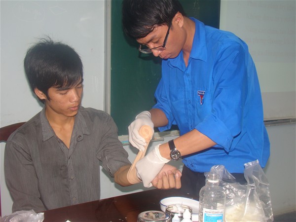 Đồng thời, các bạn sinh viên tham dự lớp tập huấn đã thực hành cách xác định tổn thương, cách cầm máu, băng bó vết thương, vận chuyển nạn nhân đến các cơ sở y tế....