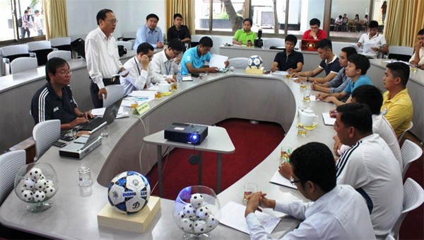 Hình 2: Thầy Đèo Đăng Khoa (áo vàng) - Trưởng bộ môn thể chất tham gia lễ bốc thăm chia bảng thi đấu ngày 11/10/2013