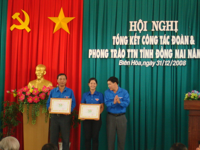 Hình 11: Đ/c Nguyễn Hồ Xuân Hương - Bí thư Đoàn trường (giữa) nhận danh hiệu đơn vị dẫn đầu thi đua năm 2008 từ Đ/c Bùi Xuân Thống  - Bí thư Tỉnh Đoàn Đồng Nai (bên phải)