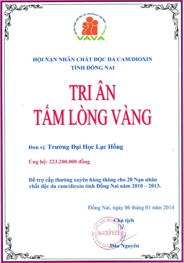 Sáng ngày 10/01/2014 tại Hội trường Tỉnh ủy Đồng Nai, Hội Nạn nhân chất độc da cam tỉnh Đồng Nai đã tổ chức Lễ kỷ niệm 10 năm thành lập Hội. Cũng trong dịp này đơn vị trường Đại học Lạc Hồng đã vinh dự được trao tặng bằng khen của UBND tỉnh Đồng Nai trong phong trào thi đua “Vì nạn nhân chất độc da cam”  từ năm 2011 – 2013 và Thư Tri ân của Hội nạn nhân chất độc da cam/Điôxin tỉnh Đồng Nai.