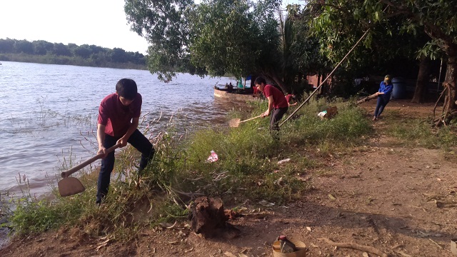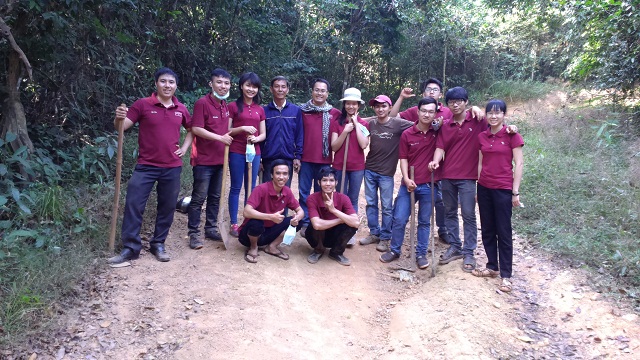 Hình 3- Phối hợp cùng người dân địa phương san lấp đoạn đường bị sụt, lún