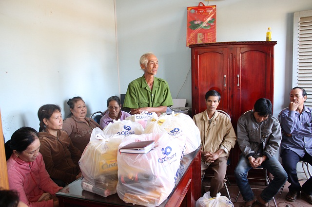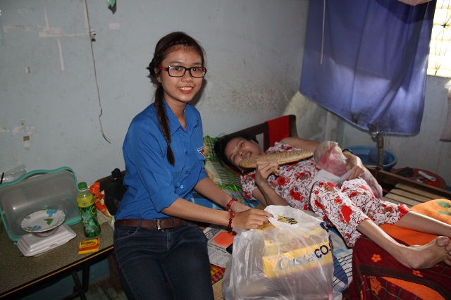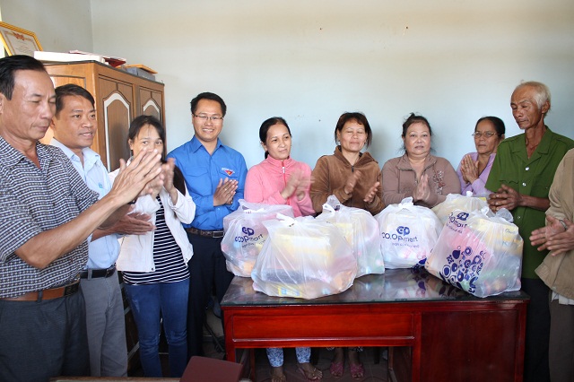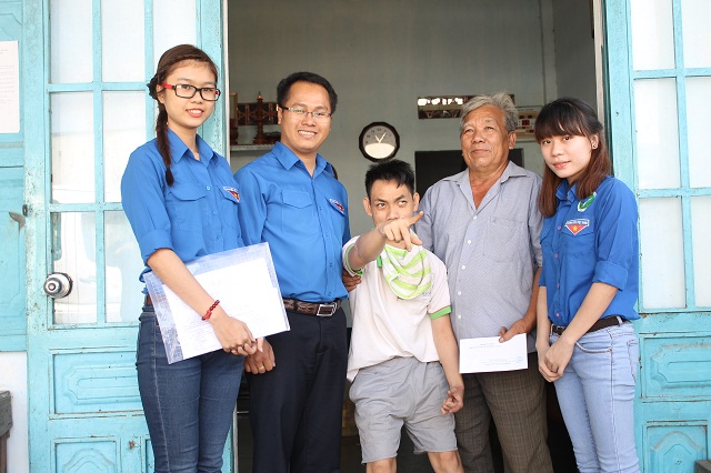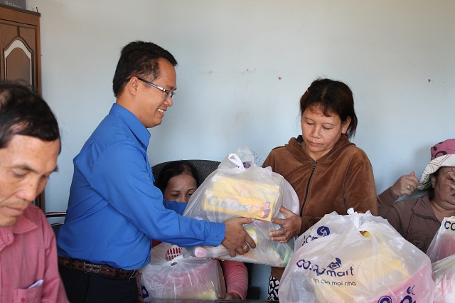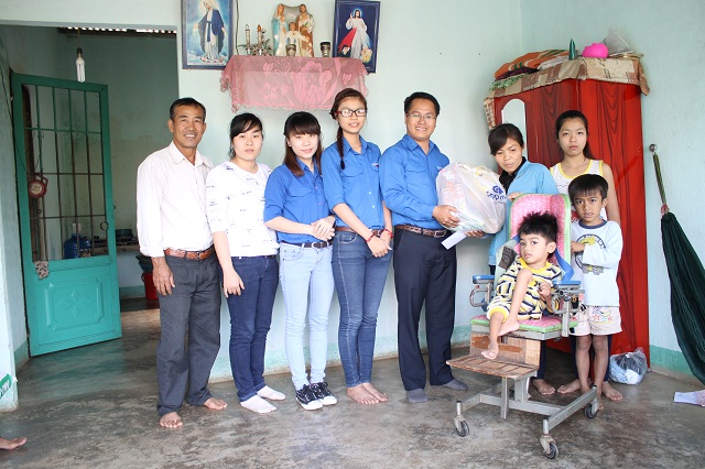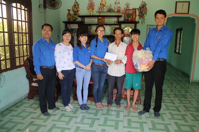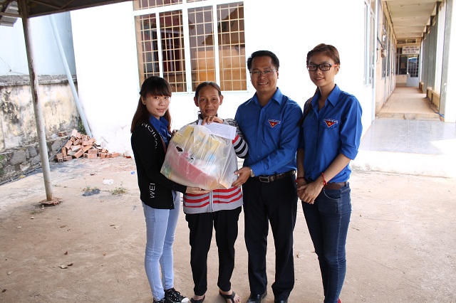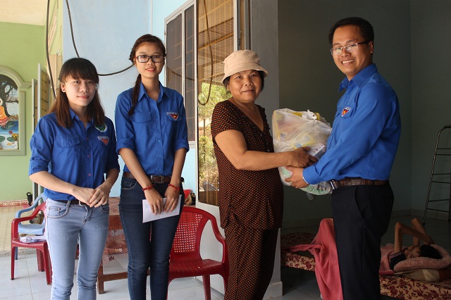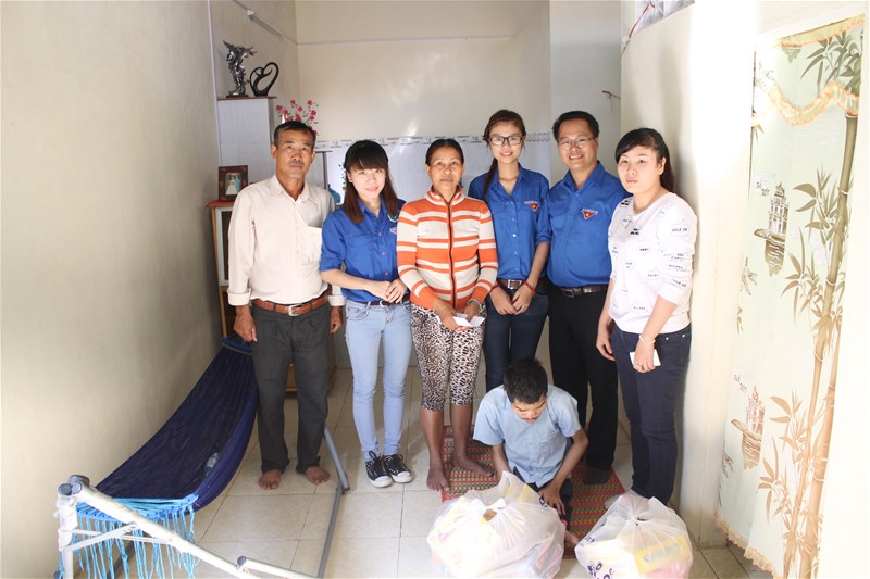 Hình 2- Đ/c Huỳnh Thúc Hiếu - Phó chủ tịch Hội sinh viên trường trao tặng quà cho các gia đình nạn nhân chất độc da cam