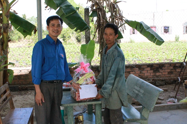 Hình 2: Thầy Đỗ Hữu Tài trao tặng quà cho nạn nhân chất độc da cam