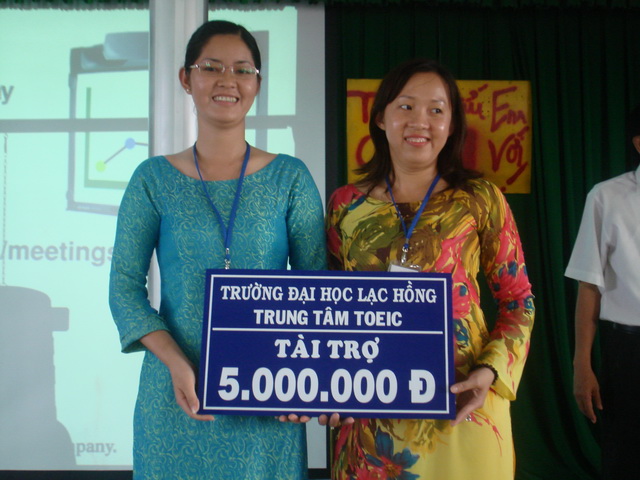 Hình 13: Th.s Nguyễn Hồ Xuân Hương (áo dài xanh) đang nhận tài trợ của TT Toeic