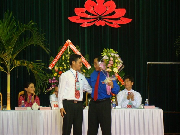 Hình 7: Đ/c Lê Sơn Quang tặng hoa Đ/c Bùi Xuân Thống - Bí thư Tỉnh Đoàn sau bài phát biểu đại diện của Tỉnh đoàn Đồng Nai.