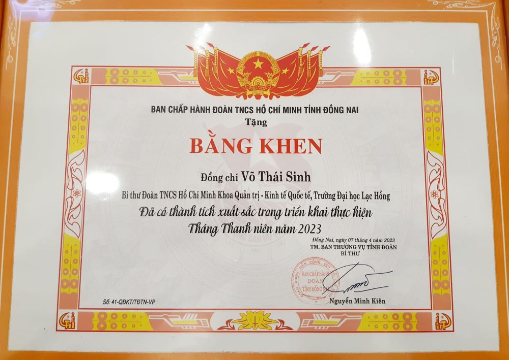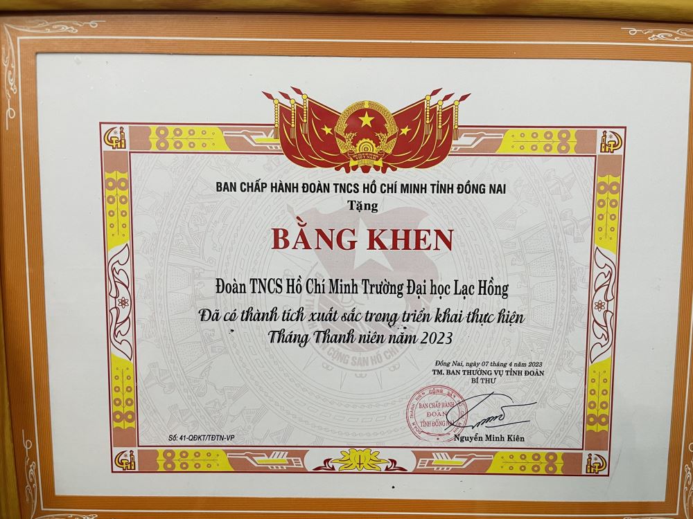 Đoàn trường Đại học Lạc Hồng nhận bằng khen của Tỉnh đoàn Đồng Nai trong Tháng Thanh niên 2023