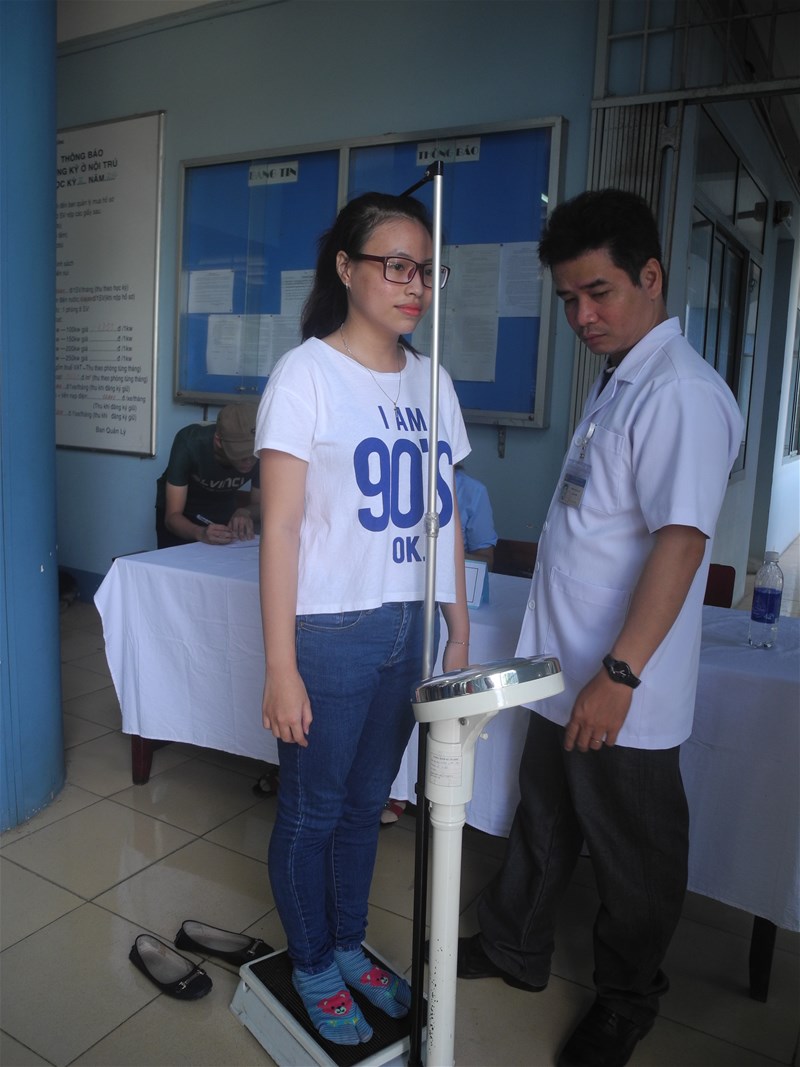 Tại buổi kiểm tra sức khỏe, các bạn sinh viên đã được khám thể lực (cân nặng, chiều cao), khám lâm sàng nội khoa (tuần hoàn, tiêu hóa, hô hấp, cơ xương khớp...) ngoại khoa, xét nghiệm máu, đo huyết áp, khám mắt, da liễu, tai mũi họng, răng hàm mặt...
