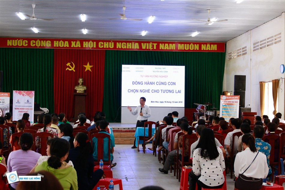 Đồng cảm và thấu hiểu được những băn khoăn, cần làm gì của bậc phụ huynh Trường THPT Nguyễn Hữu Cảnh (Tp. Biên Hòa, tỉnh Đồng Nai) giúp con mình lựa chọn ngành nghề phù hợp, ngày 16/12/2018, Trường Đại học Lạc Hồng đã phối hợp cùng các đơn vị tổ chức chuyên đề “Đồng hành cùng con chọn nghề cho tương lai”. Buổi tư vấn chuyên đề đã thu hút được nhiều phụ huynh tham gia và mang đến cho phụ huynh nhiều thông tin, lời khuyên bổ ích. Đồng thời giúp cho các bậc phụ huynh quan tâm hơn, có những hành động thiết thực giúp con lựa chọn ngành nghề phù hợp trước ngưỡng cửa cuộc đời.