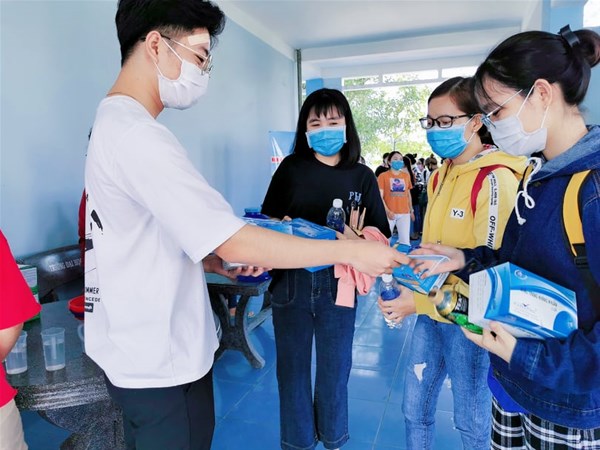 Sinh viên khoa Đông Phương - Trường ĐH Lạc Hồng nhận khẩu trang và nước rửa tay sát khuẩn chụp hình lưu niệm