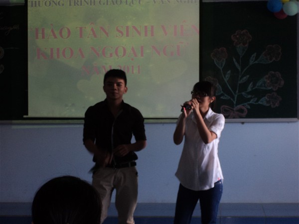 Vào lúc 14 giờ, thứ 7 ngày 15 tháng 10 năm 2011,tại phòng E306, Đoàn - Hội sinh viên Khoa Ngoại Ngữ đã tổ chức buổi giao lưu văn nghệ dành tặng các bạn tân sinh viên khóa 2011 với sự góp mặt của quý thầy cô giảng viên khoa Ngoại Ngữ, Ban chấp hành Đoàn - Hội sinh viên khoa cùng toàn thể các bạn tân sinh viên. Sau tuần học đầu tiên trong môi trường mới, các bạn dường như đã bắt đầu gắn bó và thân thiết hơn rất nhiều, điều đó tạo cho không khí càng thêm tươi vui và ấm áp. Trong suốt buổi giao lưu, những tiết mục văn nghệ, hoạt cảnh vui, hay những màn ảo thuật…do chính các bạn Ban Chấp Hành Đoàn - Hội sinh viên khoa tự dàn dựng và biểu diễn đã không ngừng khuấy động không khí và liên tục nhận được sự cổ vũ nồng nhiệt từ quý thầy cô và các bạn tân sinh viên. Sau đây là một số hình ảnh: