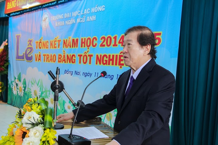 Phát biểu chỉ đạo tại buổi lễ, thầy NGND-TS Đỗ Hữu Tài - Hiệu trưởng nhà trường đánh giá cao thành tích đạt được của Khoa Ngôn ngữ Anh trong năm học 2014-2015, đồng thời truyền đạt những mong muốn của Ban giám hiệu đến Khoa nhằm mục đích giúp Khoa Ngôn ngữ Anh sẽ tiếp tục gặt hái nhiều thành tích tốt hơn trong năm học mới 2015 - 2016. Bên cạnh đó thầy cũng nhắn gửi đến các tân cử nhân cố gắng rèn luyện bản thân thật tốt, hội tụ đầy đủ đạo đức, trí tuệ để giúp Việt Nam vững bước trên con đường hội nhập với quốc tế.