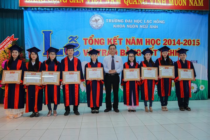 Được sự cho phép của Hội Đồng Quản Trị cùng Ban Giám hiệu nhà trường, vào lúc 08h30 ngày 11/12/2015, tập thể sư phạm Khoa Ngôn ngữ Anh đã long trọng tổ chức Lễ Tổng kết năm học 2014-2015 và trao bằng tốt nghiệp tại hội trường A301, cơ sở 1, Trường Đại học Lạc Hồng, nhằm khen thưởng các sinh viên đạt thành tích học tập khá giỏi, đồng thời trao bằng tốt nghiệp cho hơn 70 tân cử nhân.