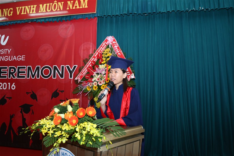 Phát biểu chỉ đạo tại buổi lễ, NGƯT-TS. Nguyễn Thị Thu Lan – Phó Hiệu trưởng nhà trường đánh giá cao thành tích đạt được của Khoa Ngôn ngữ Anh trong năm học 2015-2016, đồng thời truyền đạt những mong muốn của Ban giám hiệu đến Khoa nhằm mục đích giúp Khoa Ngôn ngữ Anh sẽ tiếp tục gặt hái nhiều thành tích tốt hơn trong năm học mới 2016 - 2017. Bên cạnh đó cô cũng nhắn gửi đến các tân cử nhân cố gắng rèn luyện bản thân thật tốt, hội tụ đầy đủ đạo đức, trí tuệ để giúp Việt Nam trên con đường hội nhập với thế giới. Khoa Ngôn ngữ Anh luôn chú trọng đến công tác đào tạo của Khoa, xây dựng chương trình học phong phú, giúp cho sinh viên khi tốt nghiệp ra trường được trang bị nhiều kiến thức, kỹ năng bám sát thực tế công việc tại các đơn vị công tác. Khoa Ngôn ngữ Anh tự tin sẽ cung cấp nguồn nhân lực chất lượng cho các đơn vị trên địa bàn nói riêng và cả nước nói chung.