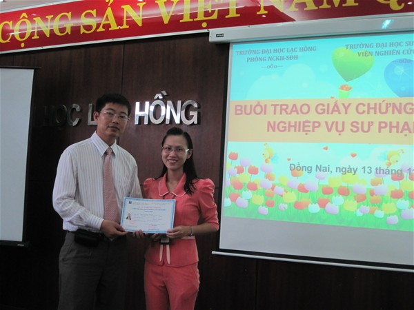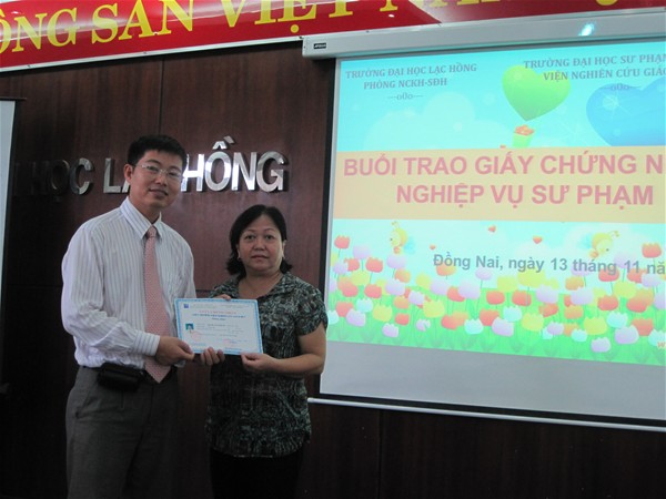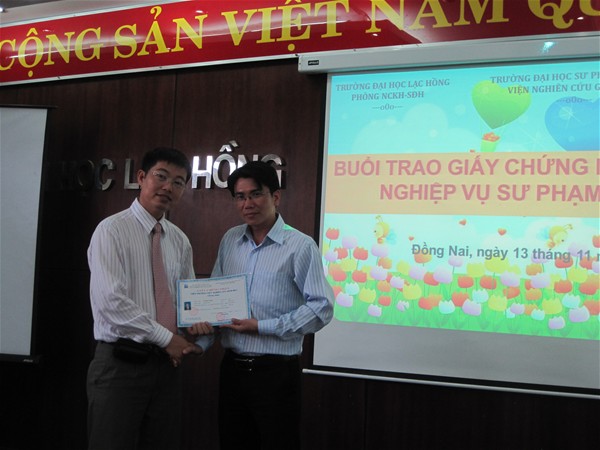 Buổi sáng ngày 13/11/2012, phòng Nghiên cứu khoa học - Sau đại học đã tổ chức buổi trao giấy chứng nhận nghiệp vụ sư phạm cho các các anh chị học viên của lớp nghiệp vụ sư phạm tại phòng B203 của Trường Đại học Lạc Hồng.