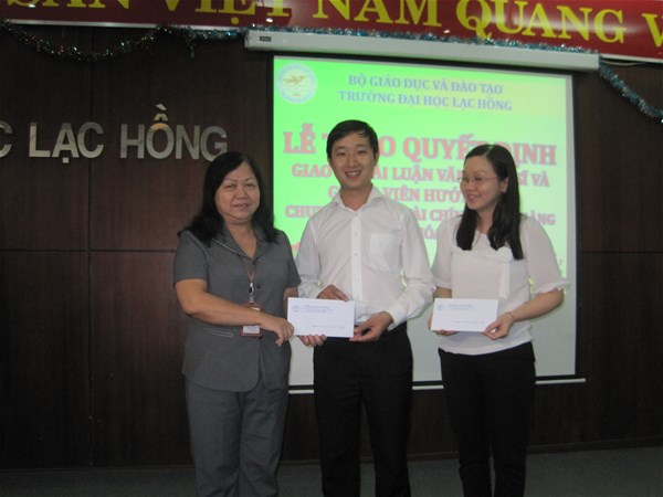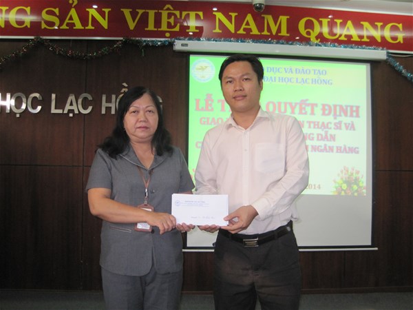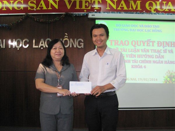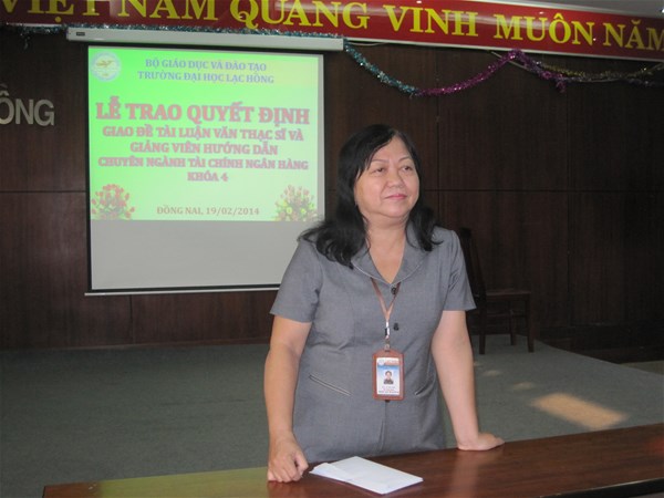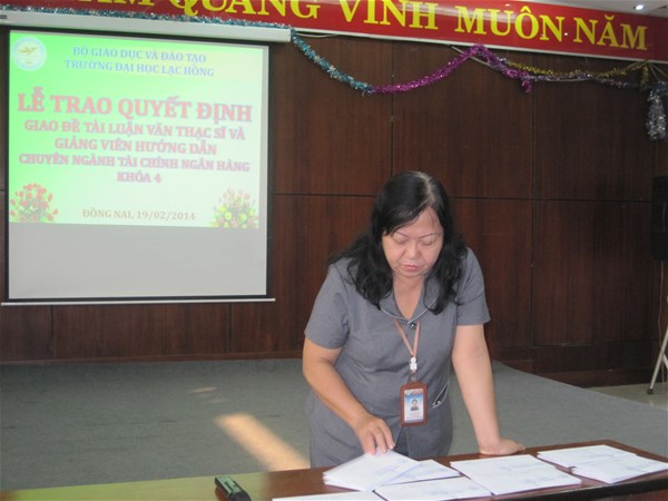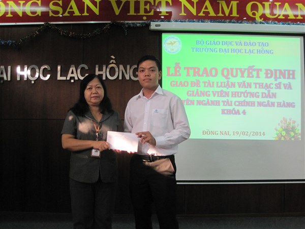 Căn cứ kết quả đánh giá của hội đồng từ buổi định hướng đề tài, vào ngày 19/02/2014, tại phòng B203, Trường Đại học Lạc Hồng đã tổ chức Lễ trao quyết định giao đề tài luận văn thạc sĩ cho các học viên ngành Tài chính ngân hàng khóa 4 năm 2012 đã có kết quả đạt từ buổi định hướng. ThS. Lê Thu Thủy - Phó trưởng phòng Sau đại học đã thay mặt Nhà trường trao quyết định giao đề tài cho các học viên nói trên.