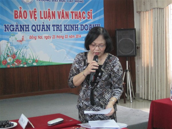 Sáng ngày 23/3/2014, Trường Đại học Lạc Hồng tổ chức Lễ bảo vệ luận văn thạc sĩ chuyên ngành Quản trị kinh doanh cho 12 học viên cao học của Trường. Đến tham dự buổi bảo vệ luận văn thạc sĩ gồm có các thầy cô trong hội đồng đánh giá như PGS.TS Nguyễn Thị Liên Diệp, PGS.TS  Hồ Tiến Dũng, TS Nguyễn Văn Tân, TS Tạ Thị Kiều An, TS Mai Thanh Loan, TS Ngô Quang Huân cùng các anh chị học viên chuyên ngành Quản trị kinh doanh của các khóa 2009, 2010 và 2011.