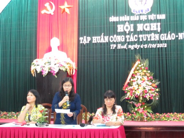 Hội nghị “Tập huấn về công tác tuyên giáo -nữ công” năm nay được tổ chức trong 2 ngày 04 và 05/10/2012, tại thành phố Huế. Hội nghị đã thu hút được 170 đồng chí cán bộ Công đoàn phụ trách Tuyên giáo, Nữ công CĐGD các tỉnh, TP trực thuộc TƯ, Công đoàn các ĐH Quốc gia, ĐH vùng, các trường ĐH, CĐ và đơn vị trực thuộc  tham gia.