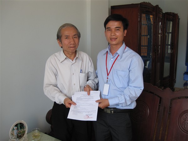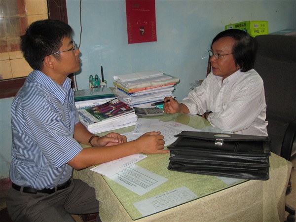 Ts. Nguyễn Văn Tân làm việc với thầy Nguyễn Văn Bốn hiệu phó trường THPT Nguyễn Công Trứ
