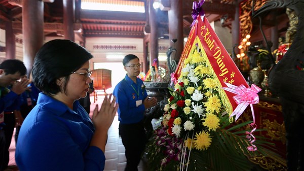 Hình 4: Thầy Nguyễn Văn Hải đại diện cho đại biểu thuộc diễn đàn 5 và đồng chí Nguyễn Thị Thu Vân – UVBTV, Trưởng Ban Thanh niên nông thôn TW Đoàn dâng hoa tưởng nhớ đến các anh hùng liệt sĩ trong khu di tích Truông Bồn.