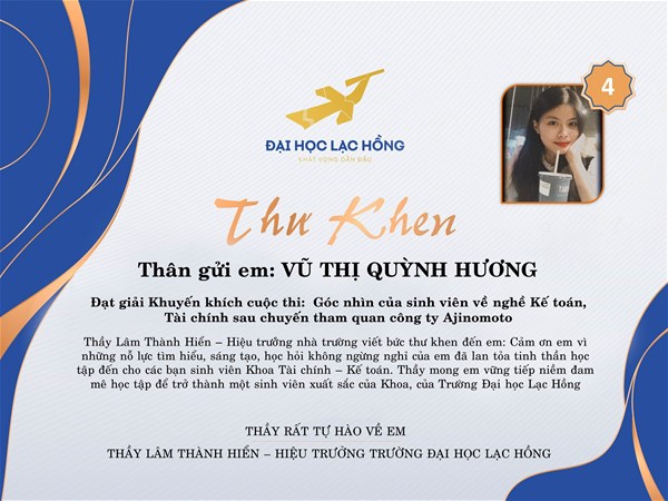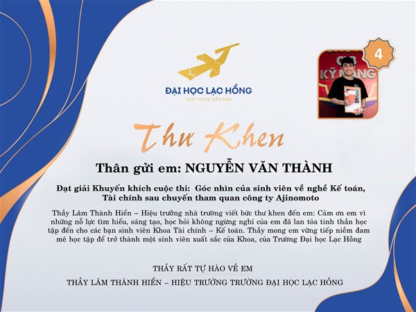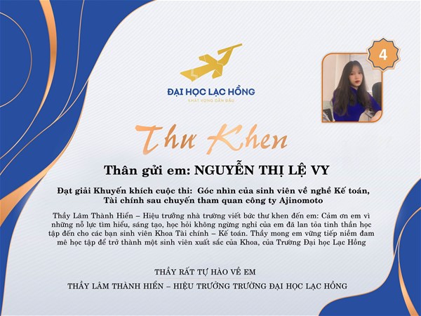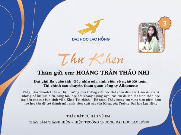Thư khen gửi các em sinh viên có thành tích xuất sắc trong cuộc thi: "Góc nhìn của sinh viên về nghề Kế toán, Tài chính sau chuyến tham quan công ty Ajinomoto", đạt các giải cao. Ngày 17/10/2021. Thầy Lâm Thành Hiển - Hiệu trưởng Trường Đại học Lạc Hồng đã viết thư khen gửi các em sinh viên có bài viết xuất sắc.