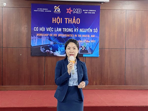 Sáng ngày 06/5/2022 tại Phòng B203, Cơ sở 1, Khoa Tài chính-Kế toán phối hợp với Ngân hàng Thương mại Cổ phần Quân Đội-Chi nhánh Đồng Nai-PGD Tam Hiệp tổ chức Hội thảo “Cơ hội việc làm trong kỷ nguyên số”. Đây là chương trình giao lưu học hỏi kinh nghiệm thực tế được MBbank-PGD Tam Hiệp chia sẻ nhằm giúp cho các bạn sinh viên nâng cao kỹ năng cần thiết phục vụ cho quá trình ứng tuyển và làm việc sau tốt nghiệp.