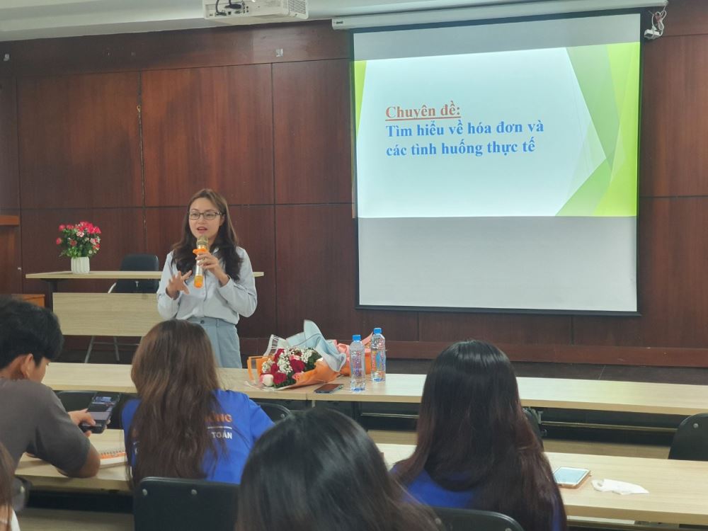 Vào ngày 12/4/2023 lúc 18h00, CLB Kế toán đã tổ chức buổi sinh hoạt định kỳ với chuyên đề "Tìm hiểu về hóa đơn và các tình huống thực tế" tại phòng B203. Sự kiện có sự hiện diện của Cô Lê Thủy Tiên - Trưởng bộ môn Hệ Thống Thông Tin kế toán, cùng với diễn giả Bà Huỳnh Vũ Huyền Trân - Kế toán tổng hợp - Công ty Cổ phần Nguồn nhân lực Siêu Việt. Buổi sinh hoạt còn thu hút sự tham gia đông đảo của các sinh viên ngành Kế toán.