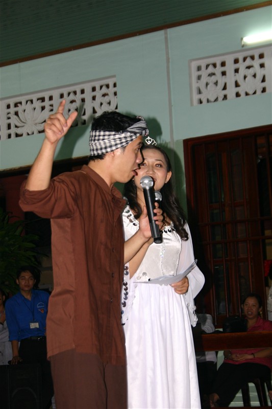 Mô phỏng câu chuyện cổ tích về chú Cuội, chị Hằng và cây Đa, vở hài kịch do các sinh viên "tự biên tự diễn" đã chiếm được nhiều cảm tình từ các khán giả nhí trong buổi văn nghệ tối 20/9 (13/8 Âm lịch) Chăm chú theo dõi vở kịch, các bé hồi hộp chờ xem không biết chú Cuội có dùng lá đa thần để cứu được ông lão hành khất không...Và các em cười thích thú khi thấy ông lão đã được cứu sống nhờ chiếc lá "cây thần" của chú Cuội. Tiếng cười giòn tan và những tràng pháo tay tán thưởng của các em nhỏ càng khích lệ tinh thần của các diễn viên trẻ tiếp tục cống hiến những màn diễn thật ấn tượng.