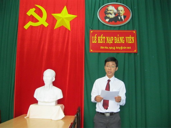 Quần chúng Phạm Việt Hùng tuyên thệ trước khi được kết nạp Đảng