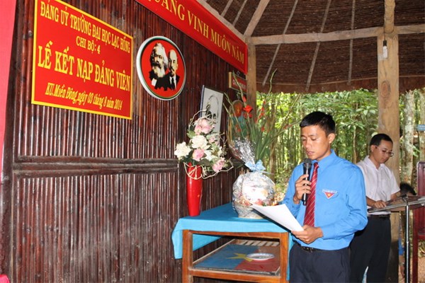 Chương trình lễ kết nạp được tổ chức tại Căn cứ khu ủy miền Đông (Chiến khu D) thuộc địa bàn xã Trị An, huyện Vĩnh Cửu, tỉnh Đồng Nai vào sáng ngày 03/8/2014. Đến dự buổi lễ kết nạp về phía Tỉnh đoàn Đồng Nai có Đ/c Bùi Xuân Thống – UV. BCH TW Đoàn, Bí thư Tỉnh đoàn Đồng Nai; về phía Đảng ủy, Ban giám hiệu nhà trường có Đ/c Nguyễn Trùng Phương – Bí thư Đảng ủy nhà trường; NGND-TS Đỗ Hữu Tài – P. Bí thư Đảng ủy, Hiệu trưởng nhà trường; NGƯT-TS Nguyễn Thị Thu Lan – P. Hiệu trưởng nhà trường; Đ/c Lê Sơn Quang – Bí thư Đoàn trường; các thầy cô là trưởng, phó các phòng, khoa; các Đ/c Bí thư, phó Bí thư, Đảng viên chi bộ 3, chi bộ 4, chi bộ 7, chi bộ 9; lãnh đạo huyện ủy, UBND huyện Vĩnh Cửu; lãnh đạo Đảng ủy, UBND xã Mã Đà; cùng với 30 sinh viên tình nguyện hiện đang công tác Mùa hè xanh tại xã Mã Đà.