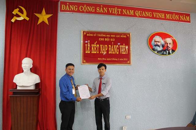 Căn cứ Quyết định của Đảng ủy khối các cơ quan tỉnh về việc kết nạp quần chúng Cao Phan Quang và quần chúng Võ Ngọc Vinh vào Đảng Cộng sản Việt Nam, được sự thống nhất của Ban Thường vụ Đảng ủy Khối các cơ quan tỉnh Đồng Nai, Đảng ủy trường Đại học Lạc Hồng, vào lúc 10h00 ngày 15 tháng 5 năm 2015 tại phòng họp CS1 trường Đại học Lạc Hồng, chi bộ 03 đã tiến hành tổ chức lễ kết nạp đảng viên cho quần chúng Cao Phan Quang và quần chúng Võ Ngọc Vinh vào Đảng Cộng sản Việt Nam; đến dự buổi lễ kết nạp có đồng chí Nguyễn Trùng Phương – Bí thư Đảng ủy trường cùng toàn thể đảng viên trong chi bộ 03.