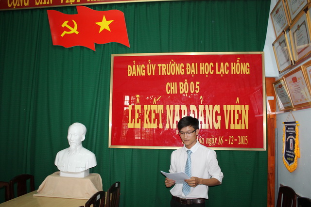 Được sự thống nhất của Ban Thường vụ Đảng ủy Khối, Đảng ủy trường Đại học Lạc Hồng, ngày 16 tháng 12 năm 2015 tại văn phòng Đảng ủy trường (Cơ sở 3, Đại học Lạc Hồng), Chi bộ 5 đã tiến hành tổ chức lễ kết nạp Đảng viên cho quần chúng xuất sắc Phan Đức Ngọc vào Đảng Cộng sản Việt Nam; Đến dự buổi lễ kết nạp có Đ/c Lê Sơn Quang – Ủy viên Ban Thường vụ Đảng ủy trường cùng toàn thể Đảng viên trong Chi bộ.